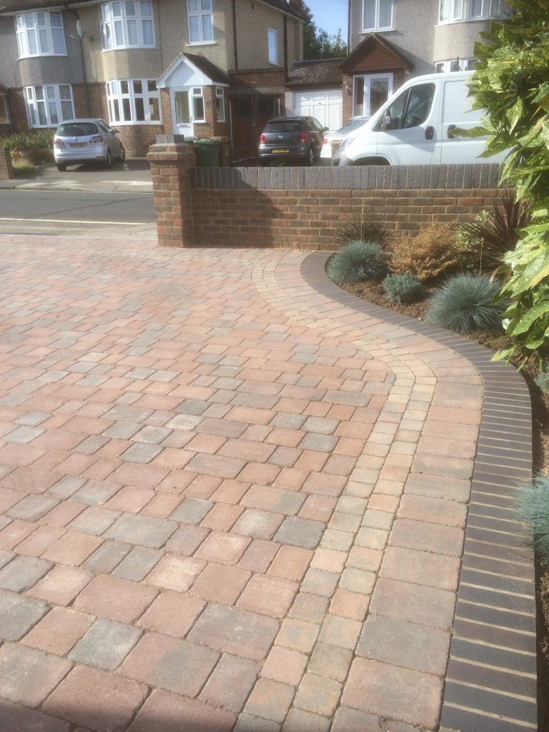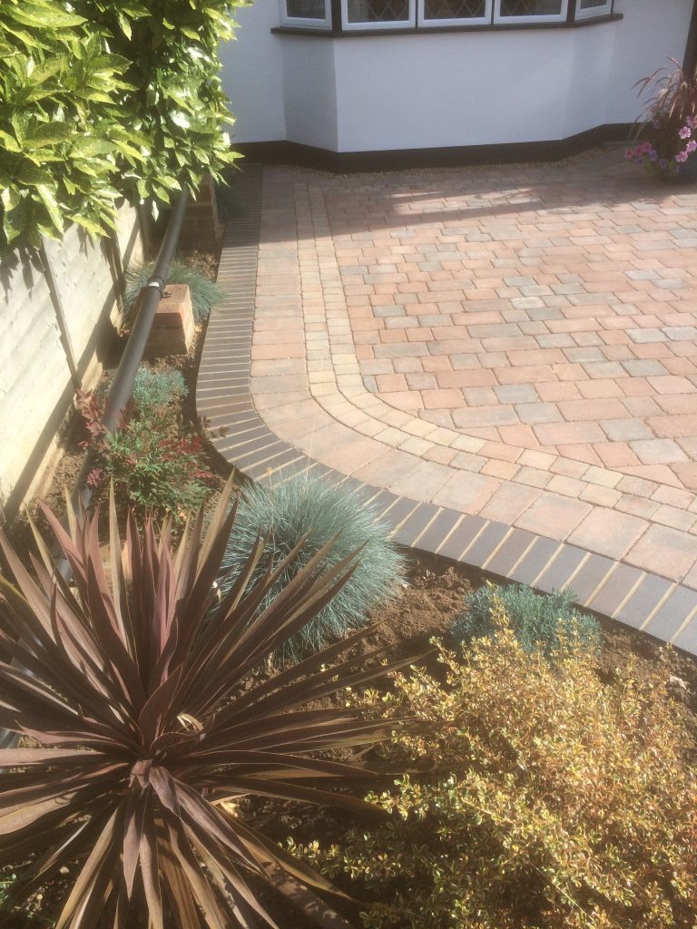 This three-week project involved completely modernising our client’s tired-looking back garden with a stunning new patio (using vitrified symphony paving in barley), border (using granite eclipse in graphite), spotlights, and artificial turf. We also provided colourful raised planters (built in sawn versuro walling and coping stones) and an eye-catching sandstone ball water feature. Our client was thrilled with the results.